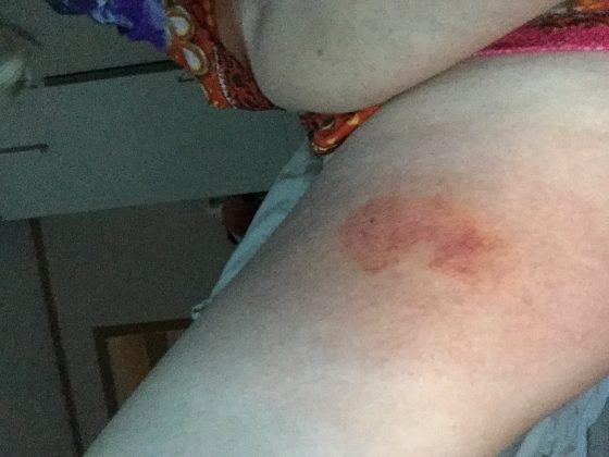 Körde till närakuten i Haninge fick träffa läkare nästan på en gång han förklarade att det ser typiskt ut som borrelia Det ser lite ut som en darttavla. Hade rivit runt i ett buskage. Trodde det var en bit av en gren eller kvist som fastnat på låret. Bara drog ut den och spola ner. Såg ingen fästing Klämde lite så inga rester skulle vara kvar. Trodde det var därför det såg ut som blåmärke. Så sällan får jag inte sådant. Hoppas du har lite hjälp av min info.
